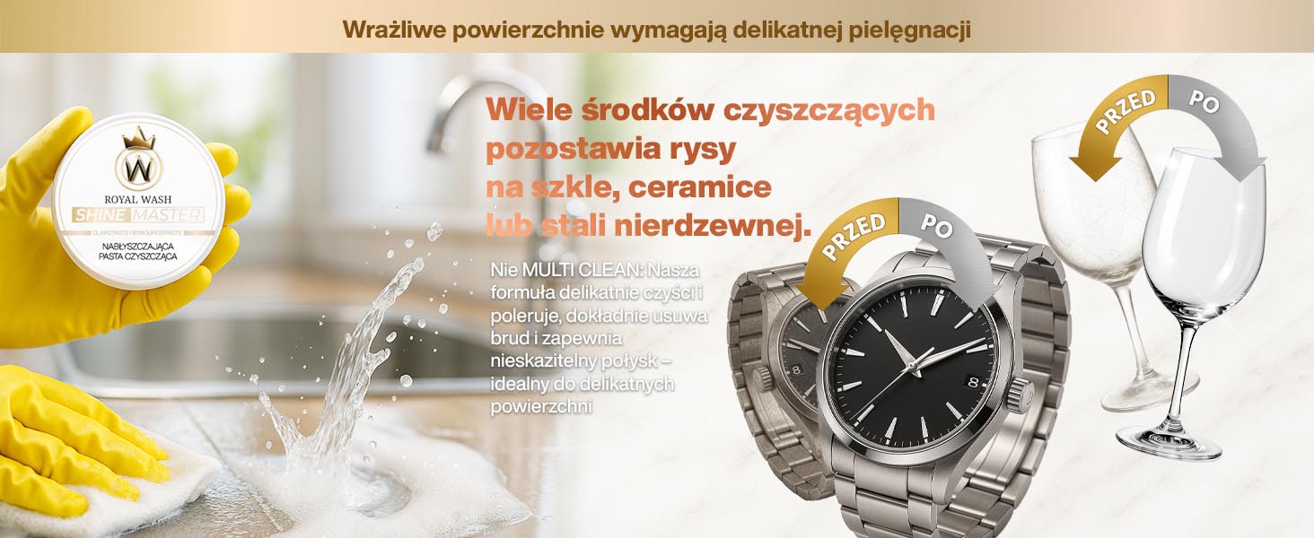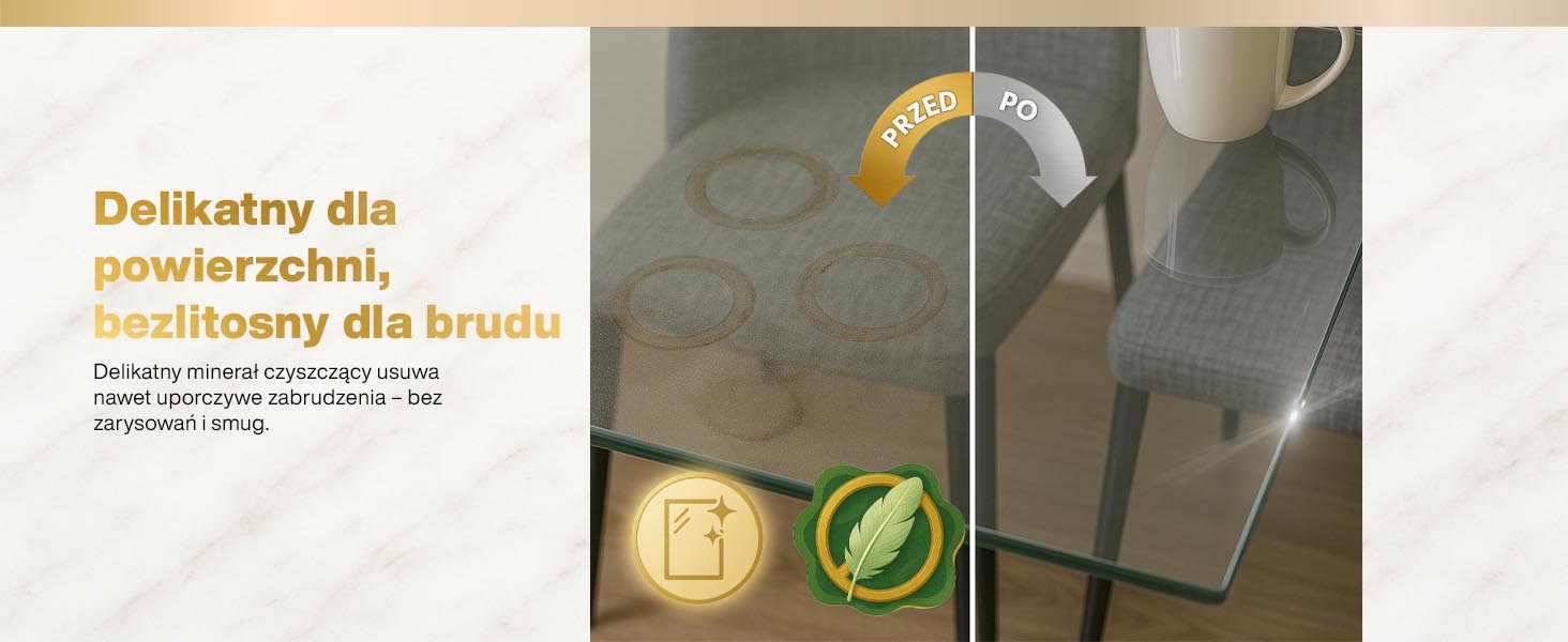 Shine Master ma aksamitną konsystencję, która ułatwia aplikację i pozwala precyzyjnie czyścić nawet delikatne materiały. Można ją stosować do blatów, garnków, płyt kuchennych, ceramiki łazienkowej, szyb, felg, metalu, szkła, a nawet biżuterii i tekstyliów. Wystarczy niewielka ilość, aby uzyskać lśniącą czystość bez smug i zacieków.