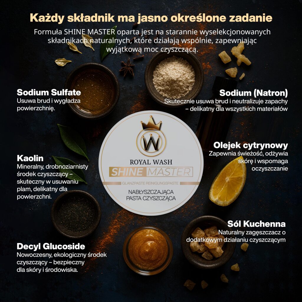 Pasta nabłyszczająca czyszcząca. Royal Wash Shine Master (250 ml) to uniwersalna pasta czyszcząca na bazie naturalnych składników, takich jak soda oczyszczona, kaolin i olejek cytrynowy. Przeznaczona do użytku domowego – idealna do kuchni, łazienki, samochodu, ogrodu oraz biżuterii. Skutecznie usuwa brud, tłuszcz i kamień, nie rysując powierzchni. POLSKI PRODUKT.